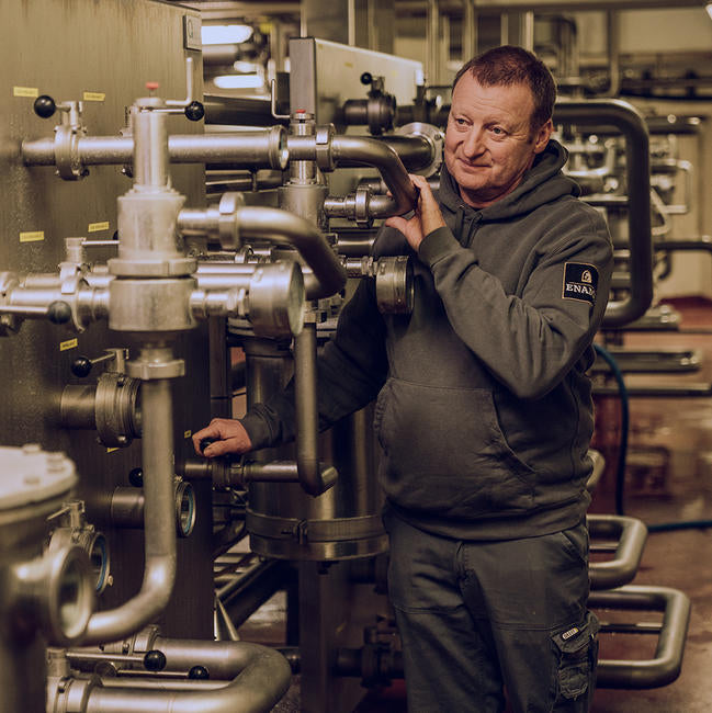 "Het effectieve productieproces begint bij mij en mijn collega-brouwers. Samen maken we de bierbrouwsels op basis van de grondstoffen die in de brouwerij geleverd worden. We werken in de brouwzaal in twee ploegen, de eerste begint eraan om 6 uur ’s ochtends en wordt om 14u afgelost door de tweede ploeg. In de brouwzaal mengen we het gemalen mout met water en volgen dan de productiestappen om het zetmeel om te zetten naar suikers en deze eruit te halen. De suikers worden door de gist in de volgende stappen omgezet naar smaakcomponenten en alcohol. Daar doen we het voor: iets nieuw produceren uit rauwe grondstoffen, dat is plezant!”